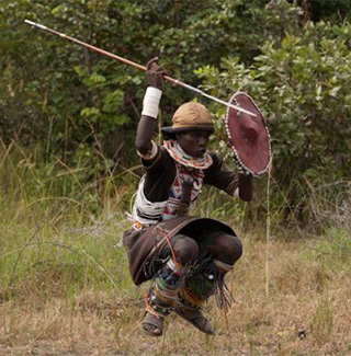 a Tanzanian lion dancer does the lion dance, which captures the adventures of the lion killer. (Adi Swami/photo)