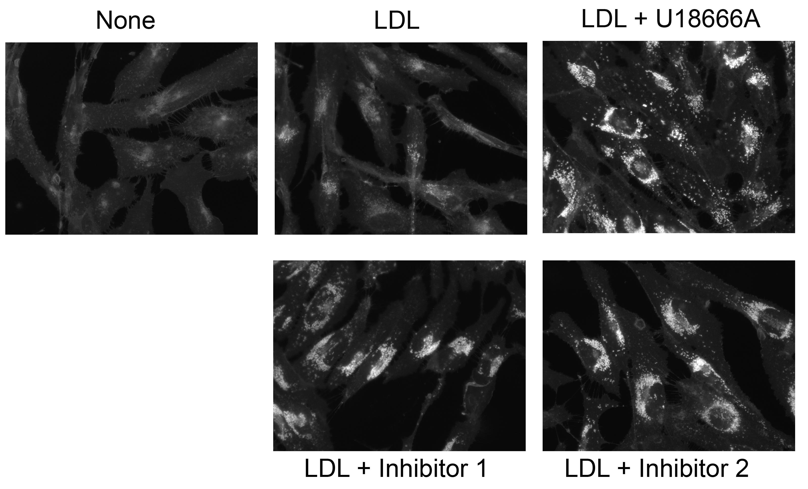 Filipin staining is a way to visualize cholesterol in cells. In the absence of LDL (None) little cholesterol can be seen in lysosomes. Upon addition of LDL (LDL) lysosomes are more visible than in the none control. LDL + 1uM U18886A or other proprietary compounds traps cholesterol in the lysosomes and mimics NPC deficient cells.