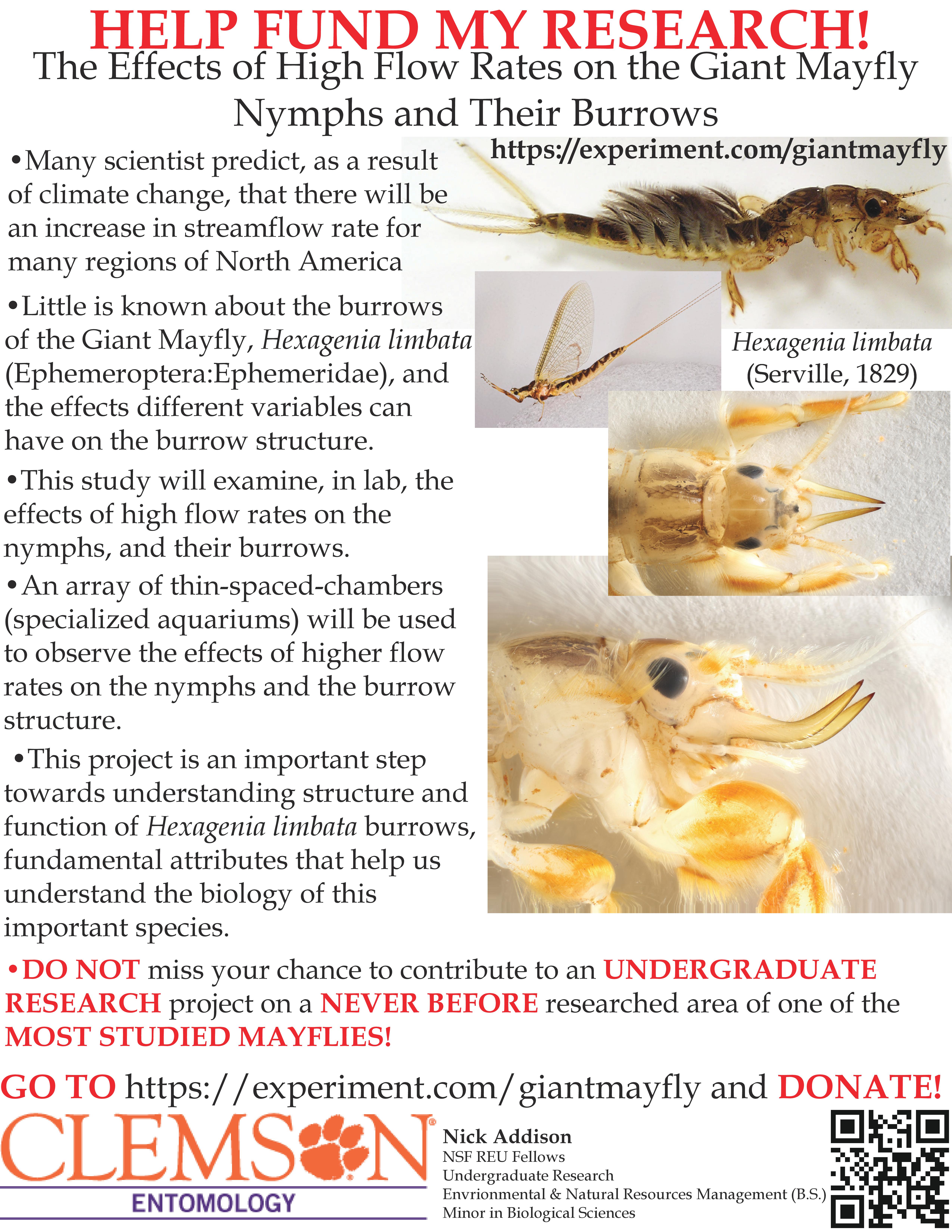 It is predicted that extreme weather events due to climate change will result in higher than average streamflow. This study will examine the effects of increased streamflow on the burrowing behavior of the giant mayfly, Hexagenia limbata, in the lab. An array of thin-spaced-chambers will be used to observe the effects of flow rate on the nymphs' U-shaped burrow structure. This undergraduate aquatic entomology research will provide new information about an otherwise well-known species.